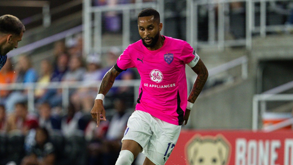 Amadou Dia started the scoring in Saturday’s 2-0 win over Indy Eleven with his career-high third goal of the season. Here, the defender reacts to a victory LouCity had to finish shorthanded after a red card foul.