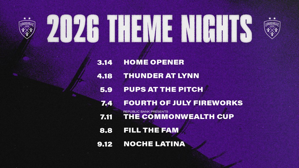 Those are the first of many 2026 promotions on a calendar that includes favorites such as Fill the Fam, Pups at the Pitch and Noche Latina. Other highlights include LouCity’s first game coinciding with Thunder Over Louisville’s air and fireworks shows, as well as a July 4 night match.