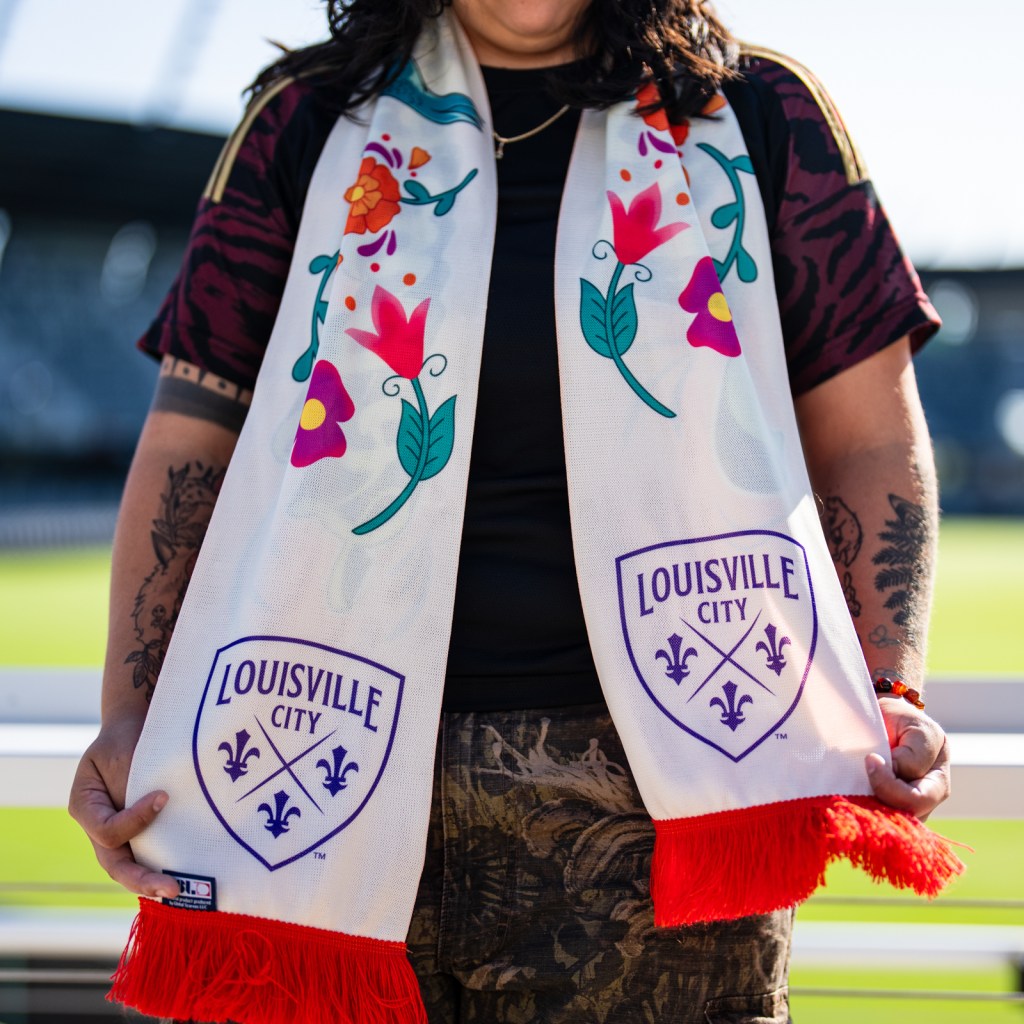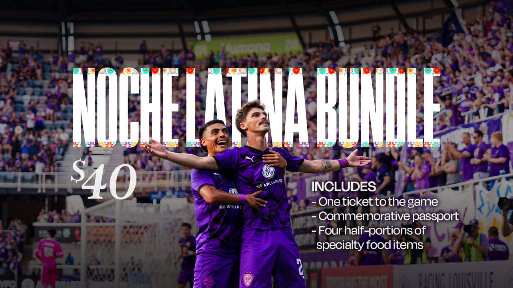 • LouCity’s players will don a warmup top designed by local artist and Colombia native Daniel Nausa. The shirt features front partnership with Adelante Hispanic Achievers, and proceeds from each jersey purchase will go toward the nonprofit devoted to empowering Latinx youth. Fans can shop both the Noche Latina warmup top and custom “Vamos Morados” scarf, designed by Rachel Nuñez, at LouSoccerStore.com.
